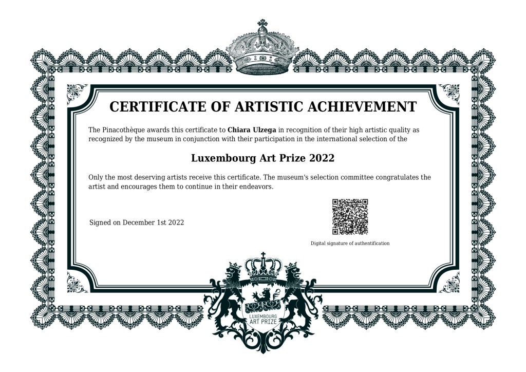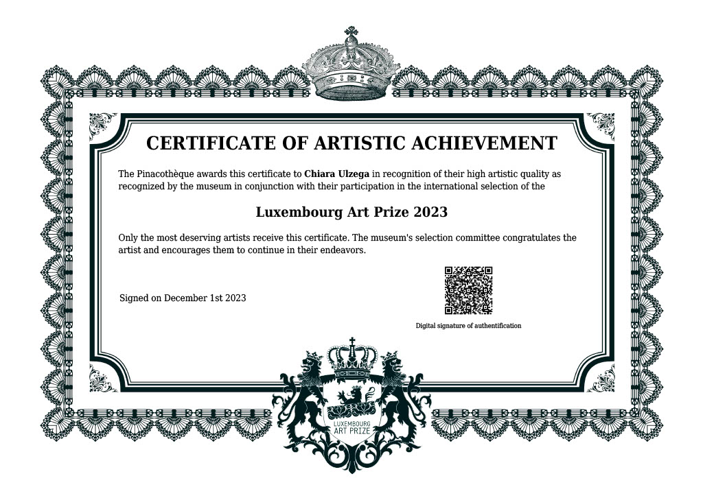 From 2022 to 2025, for four consecutive years, I was honoured to receive the Certificate of Artistic Achievement from the Luxembourg Art Prize, an award open to artists worldwide.